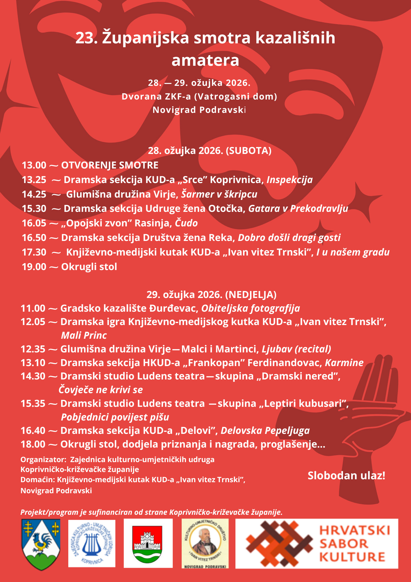 Ulaz na sve programe je slobodan, a organizatori pozivaju sve ljubitelje kazališta da svojim dolaskom podrže rad amaterskih kazališnih skupina i uživaju u bogatom kulturnom sadržaju.