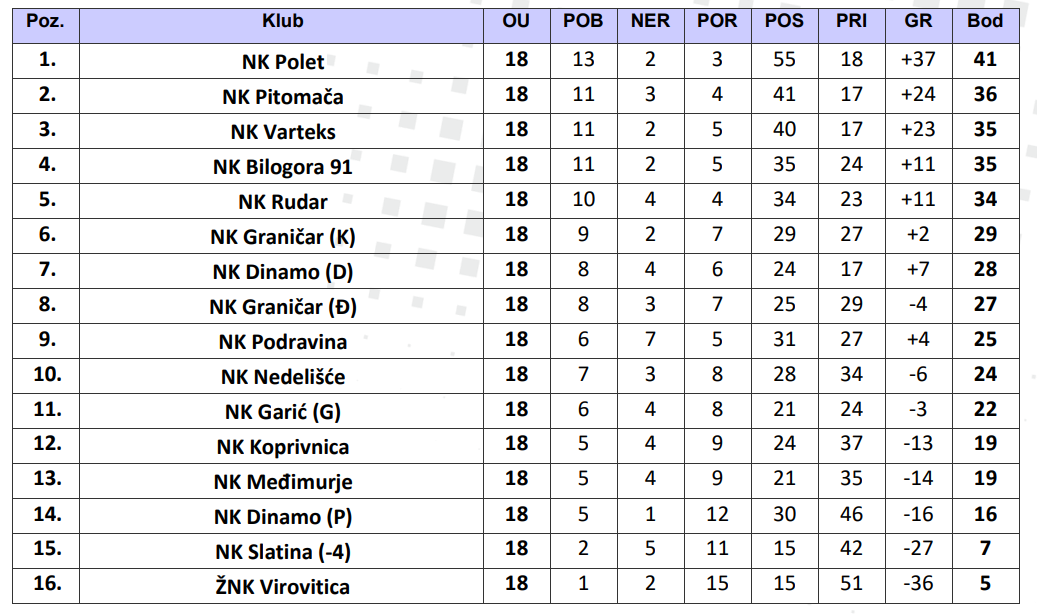 Prvenstvenu ljestvicu s 41 bodom predvodi Polet, a drugoplasirana je Pitomača koja ima 36 bodova, dok treći Varteks broji bod manje. Na začelju tablice je Virovitica s pet osvojenih bodova, a mjesto iznad Slatina s dva boda više.
