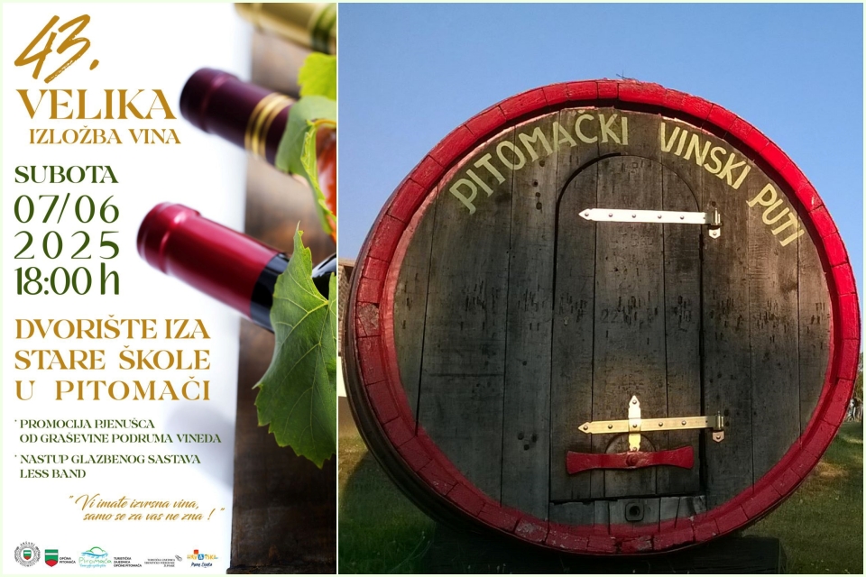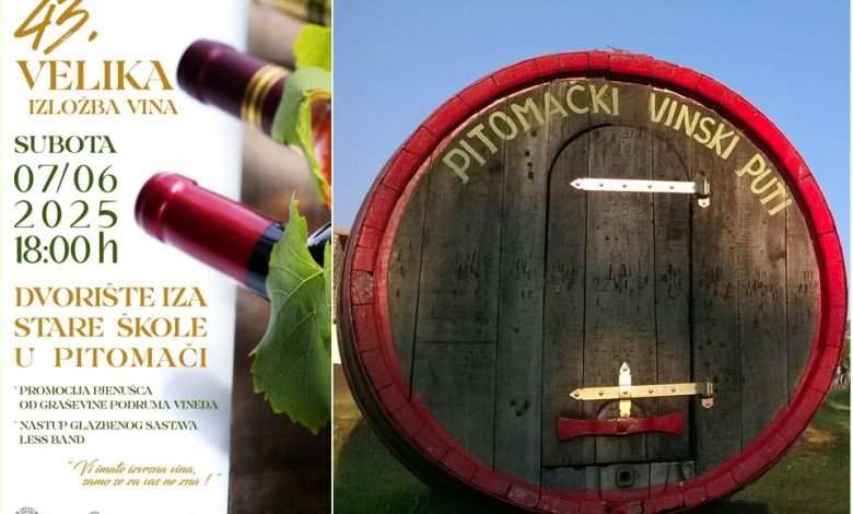 Spomenimo kako će se 43. izložba vina i dodjela medalja održati u subotu, 7. lipnja s početkom u 18 sati ispred prostorija Udruge u dvorištu stare škole u Pitomači.