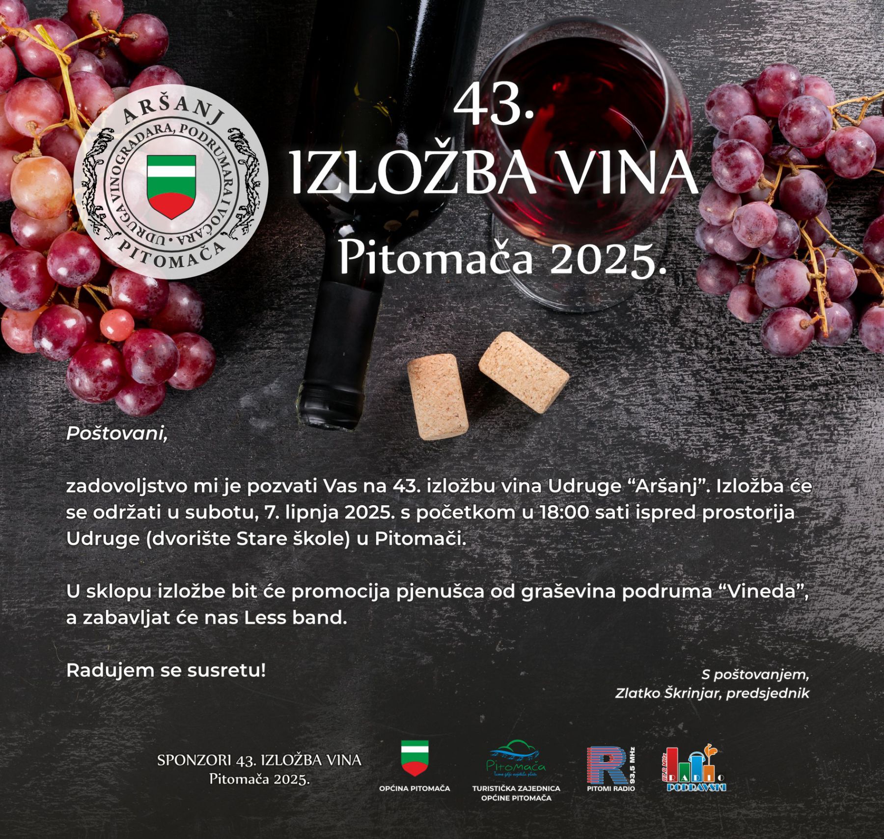 Na 43. izložbi vina u organizaciji Udruge vinogradara, podrumara i voćara “Aršanj” Pitomača, ocijenjeno je 95 uzoraka, od kojih je 38 vina nagrađeno zlatnom medaljom, 45 srebrnom, 5 brončanom, a 7 vina je ostalo neocijenjeno.