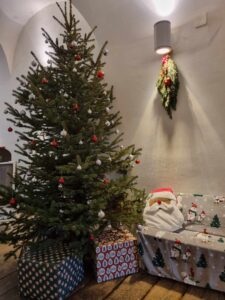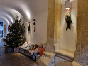 U veži utvrde i ove je godine složen foto kutak koji krasi okićena jelka, ugodna i topla klupica na kojoj su mekani plišanci, a uz zidove su ovješene ukrašene zimzelene dekoracije. Božićni ukrasi posjetitelje prate do ulaza u muzej, a potom i kroz muzejske prostore.