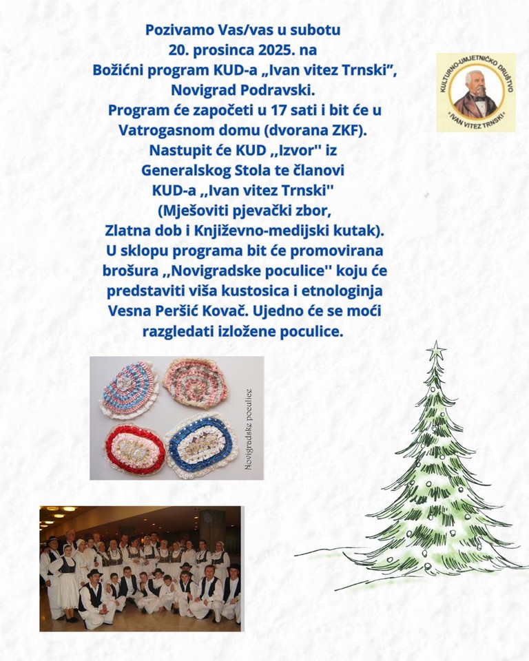 Kulturno umjetničko društvo “Ivan vitez Trnski” iz Novigrada Podravskog organizira tradicionalni Božićni program koji će se održati danas u mjesnom Vatrogasnom domu s početkom u 17 sati.