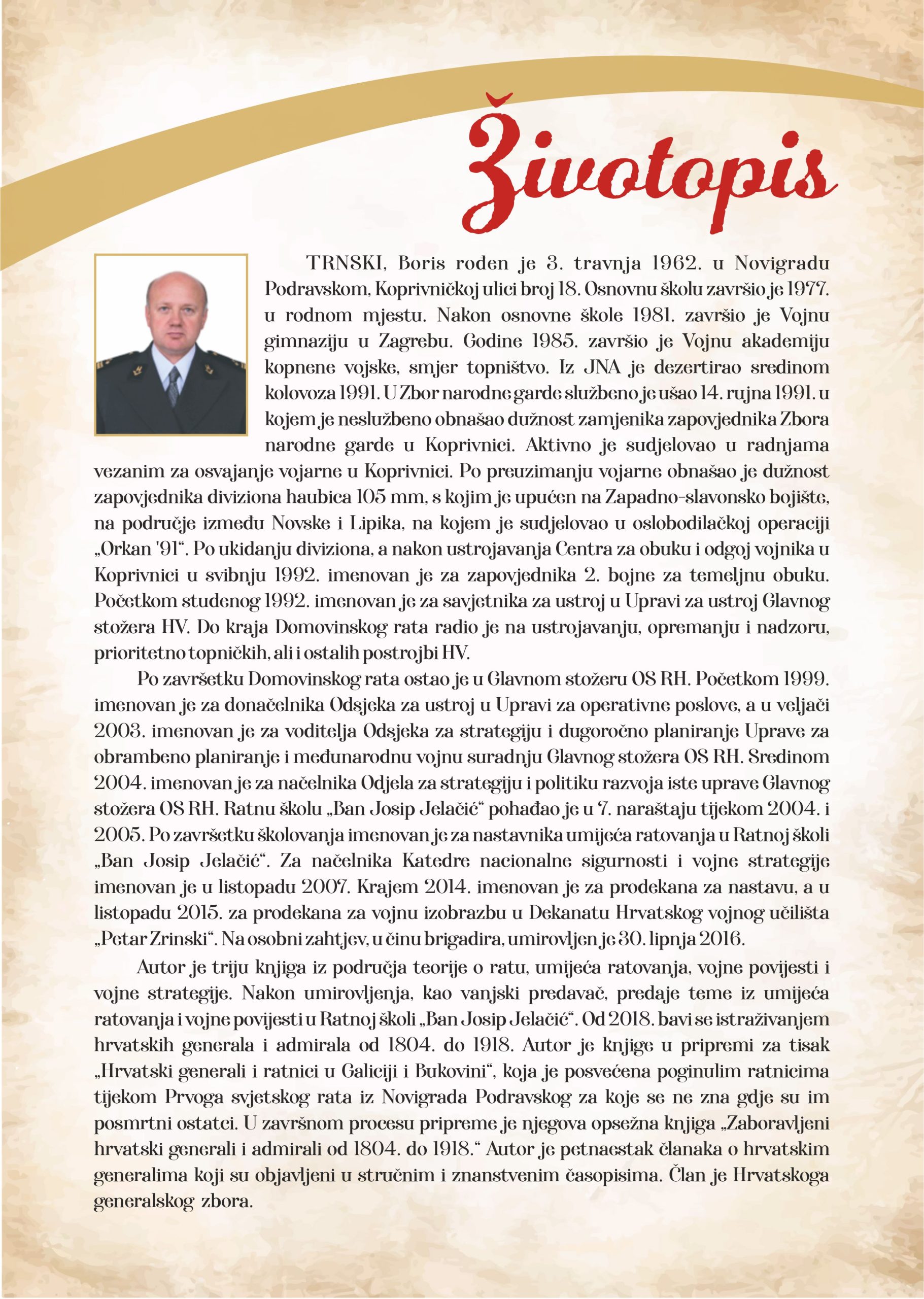 Predavač je također osobno vezan za Novigrad Podravski. Boris Trnski rođen je 3. travnja 1962. u Novigradu Podravskom, Koprivničkoj ulici broj 18. Osnovnu školu završio je 1977. u rodnom mjestu. Nakon osnovne škole 1981. završio je Vojnu gimnaziju u Zagrebu. Godine 1985. završio je Vojnu akademiju kopnene vojske, smjer topništvo. Iz JNA je dezertirao sredinom kolovoza 1991. U Zbor narodne garde službeno je ušao 14. rujna 1991. u kojem je neslužbeno obnašao dužnost zamjenika zapovjednika Zbora narodne garde u Koprivnici. Aktivno je sudjelovao u radnjama vezanim za osvajanje vojarne u Koprivnici. Po preuzimanju vojarne obnašao je dužnost zapovjednika diviziona haubica 105 mm, s kojim je upućen na Zapadno-slavonsko bojište, na područje između Novske i Lipika, na kojem je sudjelovao u oslobodilačkoj operaciji „Orkan ’91“. Po ukidanju diviziona, a nakon ustrojavanja Centra za obuku i odgoj vojnika u Koprivnici u svibnju 1992. imenovan je za zapovjednika 2. bojne za temeljnu obuku. Početkom studenog 1992. imenovan je za savjetnika za ustroj u Upravi za ustroj Glavnog stožera HV. Do kraja Domovinskog rata radio je na ustrojavanju, opremanju i nadzoru, prioritetno topničkih, ali i ostalih postrojbi HV.