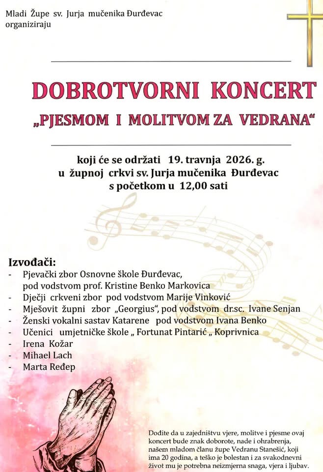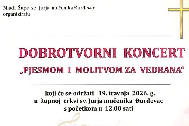 U župnoj crkvi sv. Jurja mučenika Đurđevac održat će se humanitarni koncert 19. travnja 2026. s početkom u 12:00 sati za teško bolesnog Vedrana Stanešića.