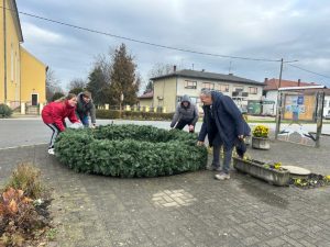 Dok je općinski načelnik Stjepan Milinković sa suradnicima preuzeo “brigu” oko namještanja adventskog vijenca, predstavnici udruga i vrtića ukrasili su prostor oko staza.
