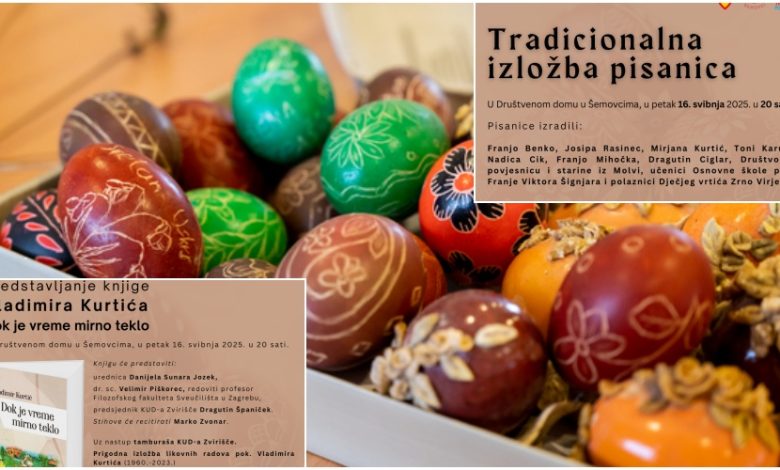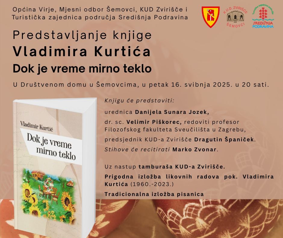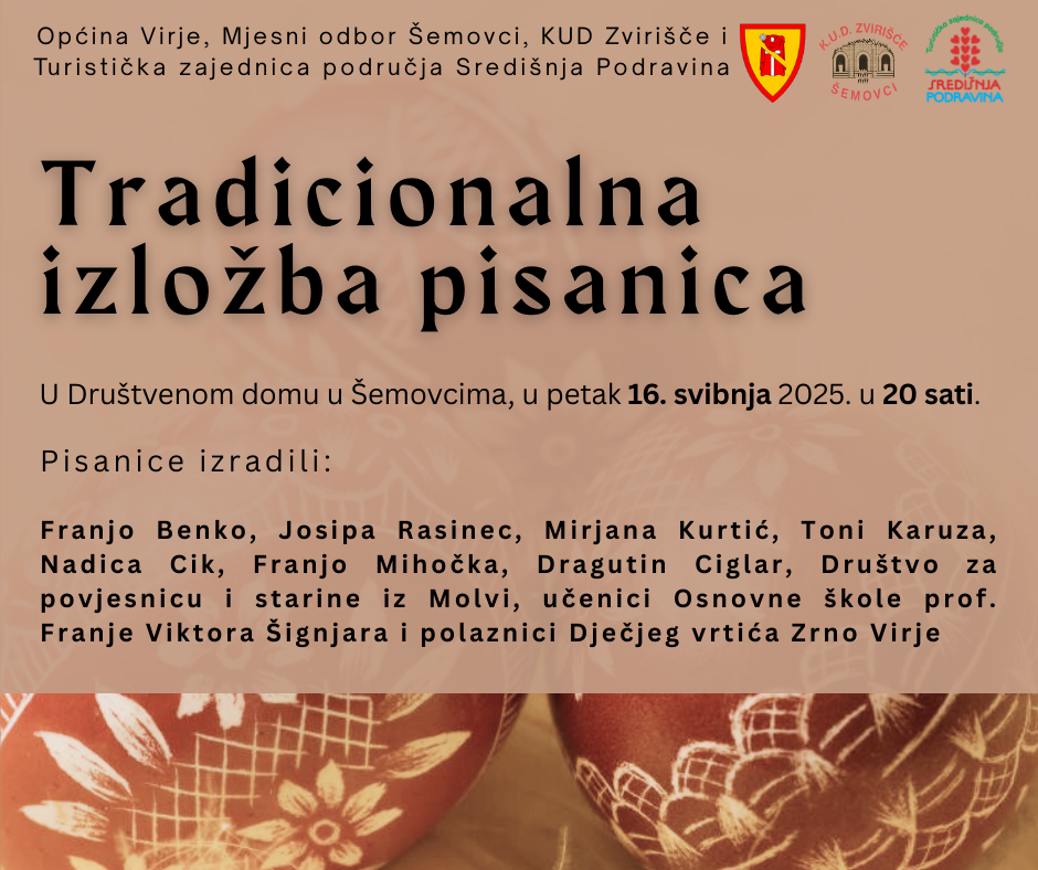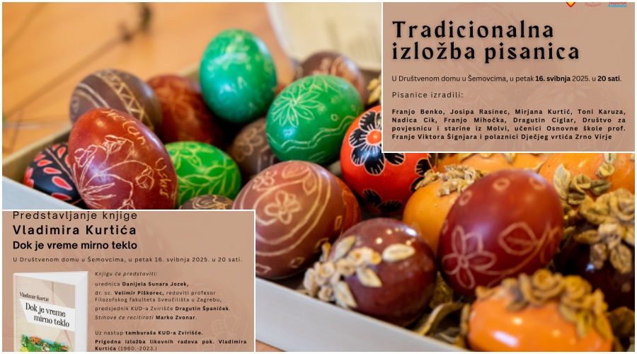 U organizaciji Općine Virje, Mjesnog odbora Šemovci, Kulturno-umjetničkog društva Zvirišče iz Šemovaca i Turističke zajednice područja Središnja Podravina, u petak 16. svibnja 2025. s početkom u 20 sati u mjesnom Društvenom domu održat će se tradicionalna izložba pisanica i predstavljanje posthumne knjige Vladimira Kurtića.