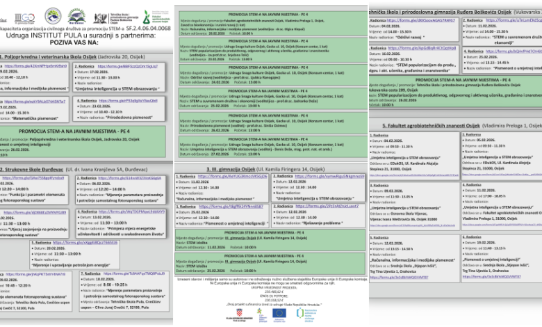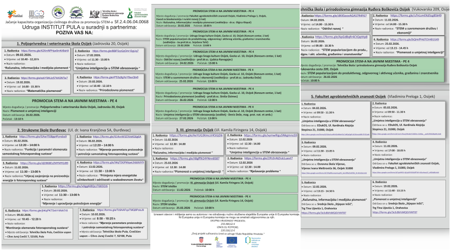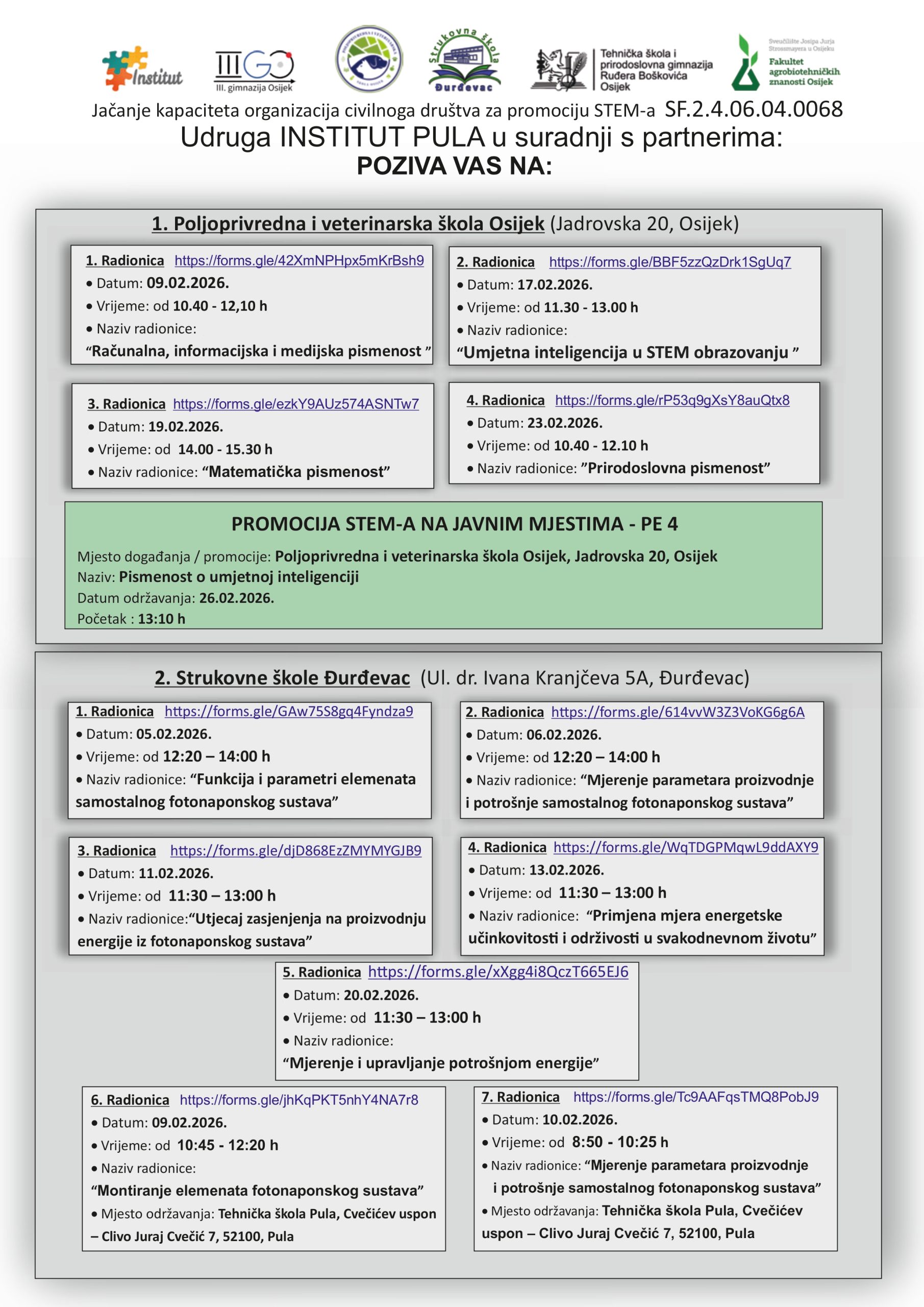 Udruga INSTITUT PULA, u suradnji s partnerskim institucijama, u sklopu projekta „Jačanje kapaciteta organizacija civilnog društva za promociju STEM-a“ (SF.2.4.06.04.0068) poziva sve zainteresirane na sudjelovanje u brojnim STEM radionicama, izložbama i javnim događanjima koji će se održavati tijekom veljače 2026. godine.