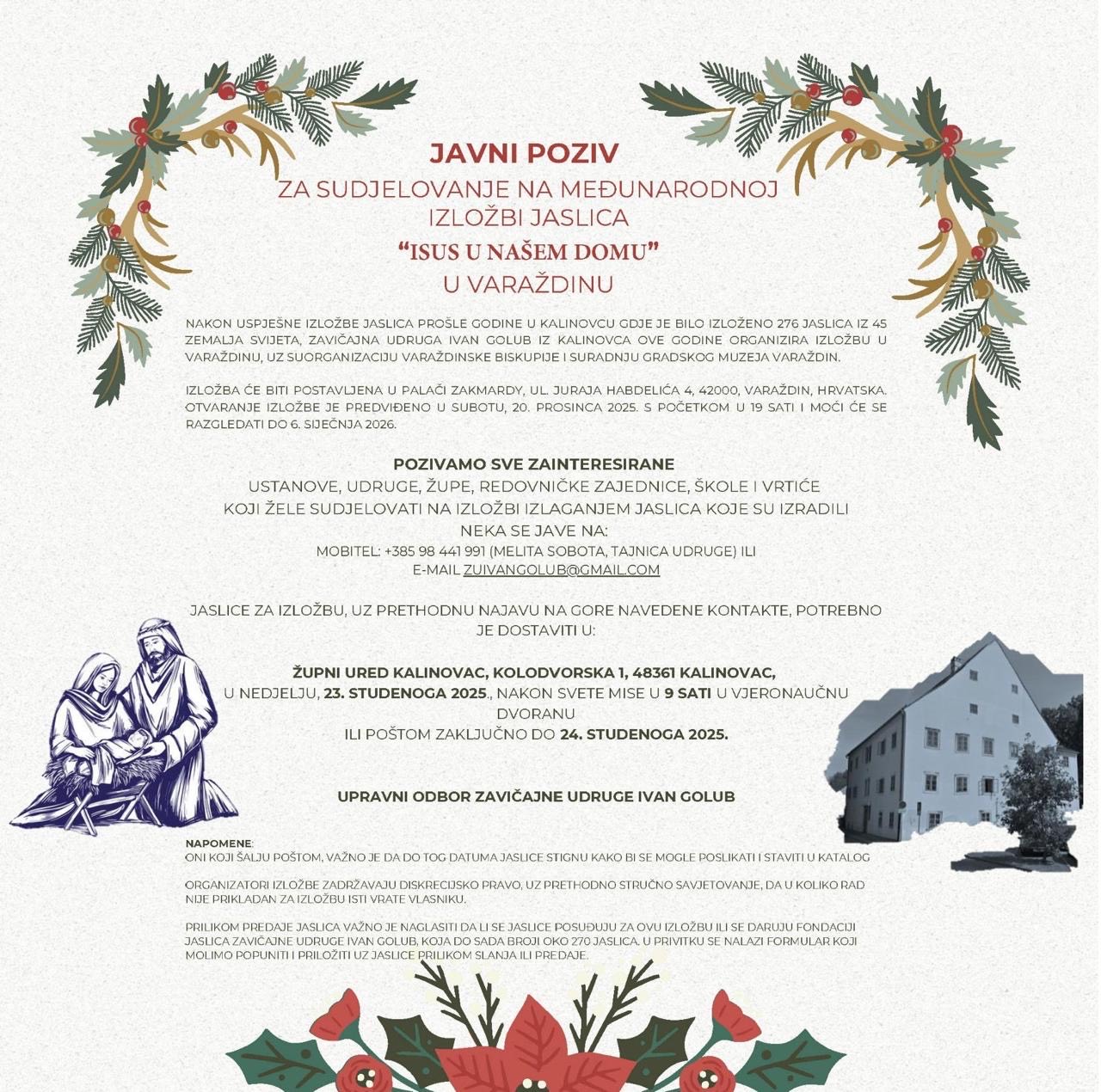 Nakon vrlo uspješne prošlogodišnje izložbe jaslica u Kalinovcu, na kojoj je predstavljeno čak 276 jaslica iz 45 zemalja svijeta, Zavičajna udruga Ivan Golub iz Kalinovca i Župa Kalinovac ove godine organiziraju izložbu u Varaždinu, uz suorganizaciju Varaždinske biskupije te suradnju Gradskog muzeja Varaždin.