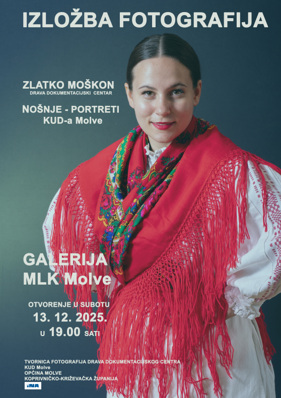 U subotu, 13. prosinca 2025. godine s početkom u 19 sati Kulturno-umjetničko društvo Molve organizira izložbu fotografija Zlatka Moškona “Nošnje – portreti KUD-a Molve“ koja će se održati u Galeriji MLK u Molvama.
