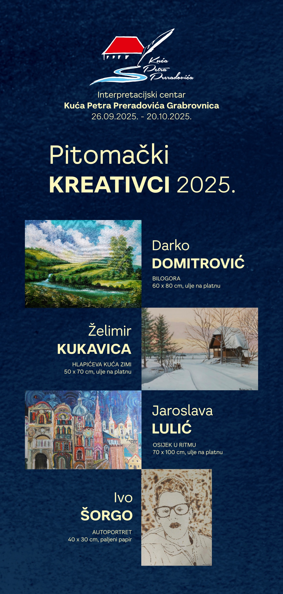 Pozivamo sve ljubitelje umjetnosti da posjete Kuću Petra Preradovića i uživaju u radovima naših kreativaca, poručuju organizatori.