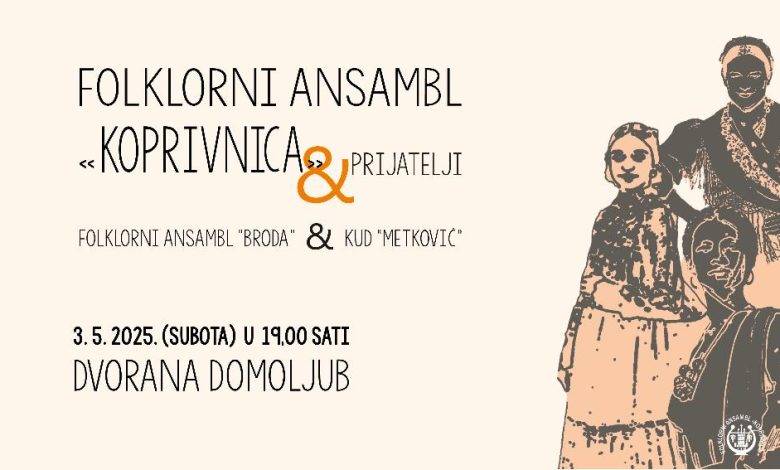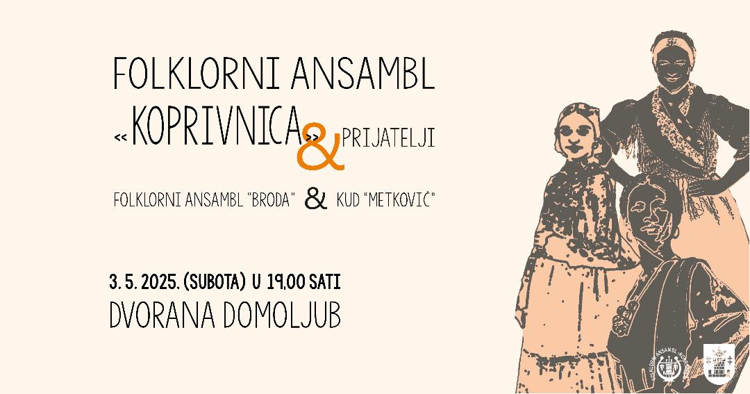 Koncert „Folklorni ansambl „Koprivnica“ i prijatelji“ održat će se u subotu 3. svibnja 2025. godine, u dvorani Domoljub, s početkom u 19 sati. Koprivničku publiku očekuje bogat program folklornih izvedbi iz raznih krajeva Hrvatske.