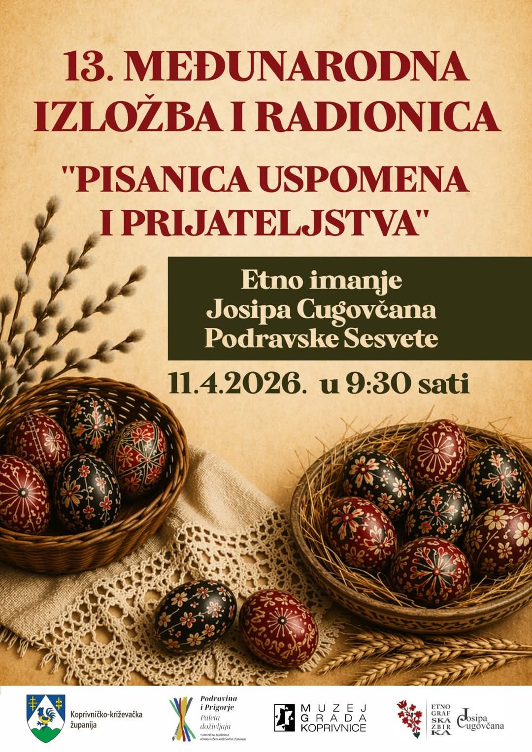 U subotu, 11. travnja, na Etno imanju Josipa Cugovčana u Podravskim Sesvetama održat će se 13. međunarodna izložba i radionica „Pisanica – uspomena i prijateljstva”.