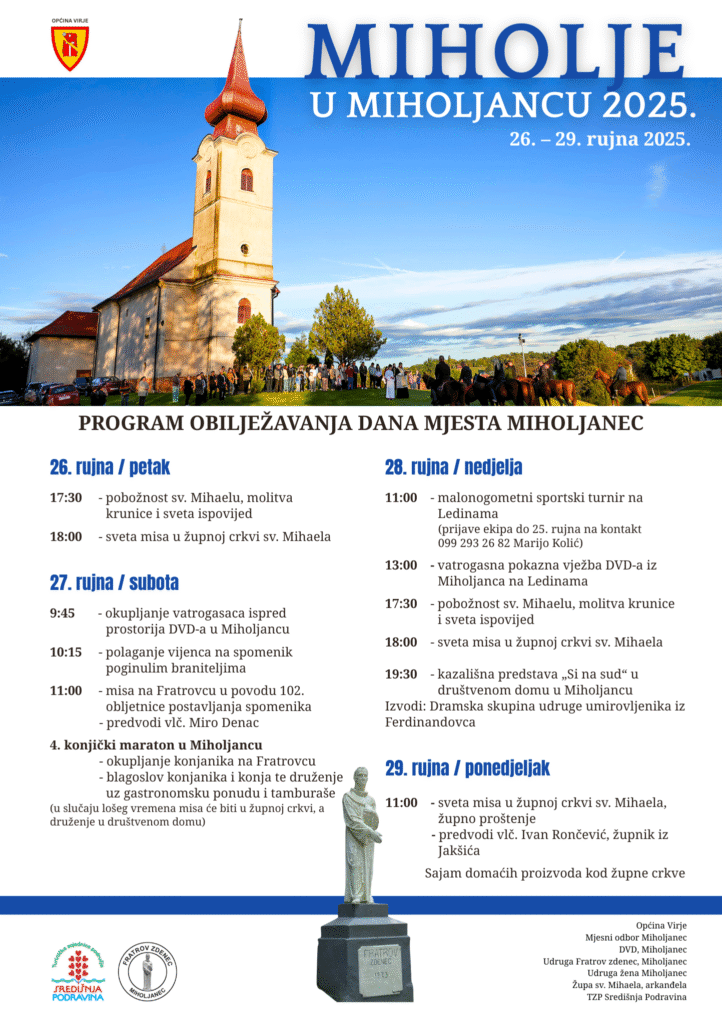 Miholjanec će od 26. do 29. rujna svečano obilježiti Dan mjesta i blagdan sv. Mihaela arkanđela, zaštitnika naselja.