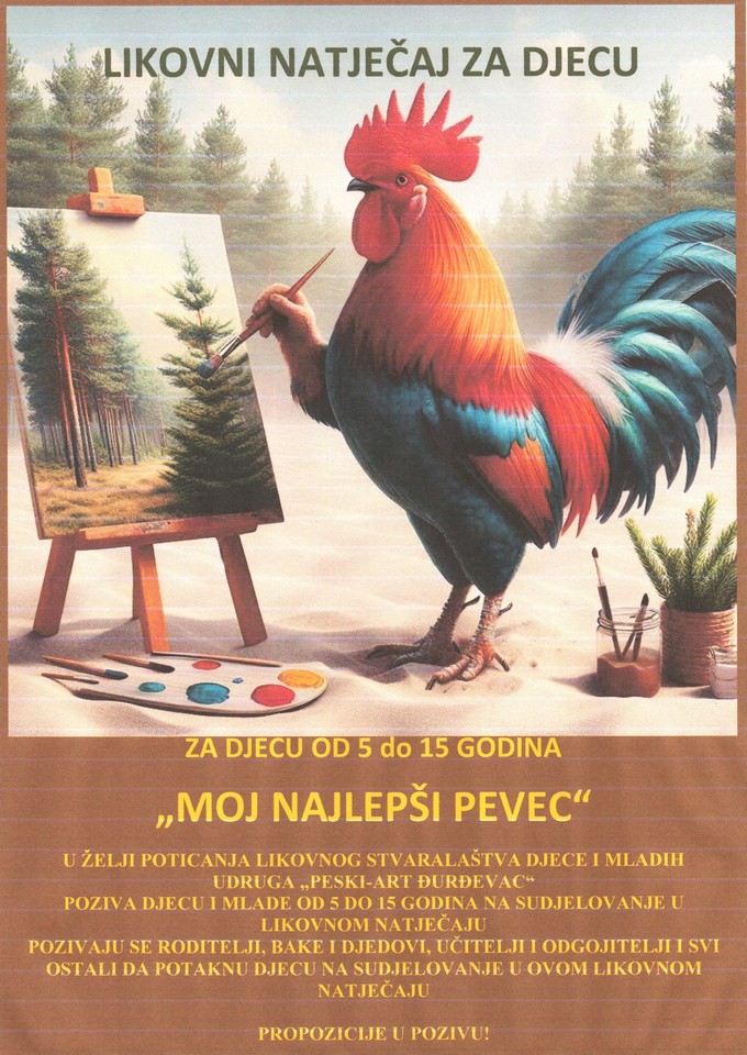 Natječaj “Moj najlepši pevec” vrijedi za svu djeci u dobi od pet do 15 godina koja su sklona kreativnom izražavanju, a sve što trebaju je izraditi sliku na temu pijetla i to bilo kojom slikarskom ili umjetničkom tehnikom.
