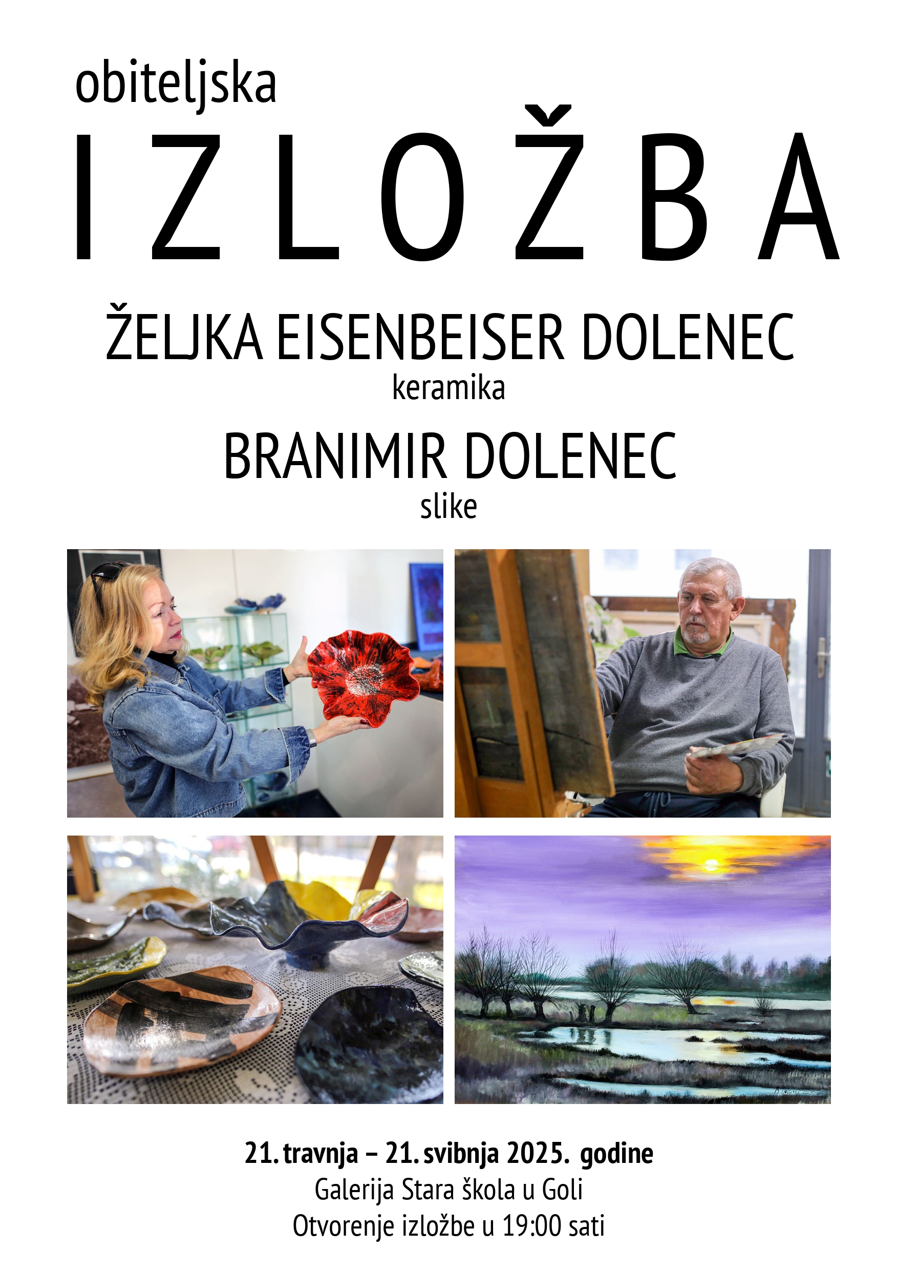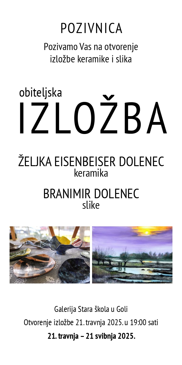 Na Uskrsni ponedjeljak, 21. travnja u Galeriji Stare škole u Goli održat će se otvorenje izložbe keramike i slika Željke Eisenbeiser Dolenec i Branimira Dolenca.