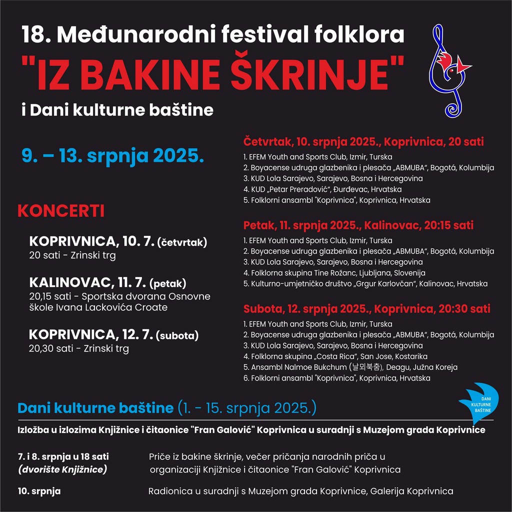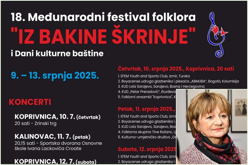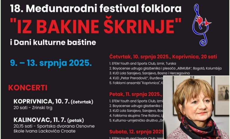 Koprivnica i Kalinovac će od 9. do 13. srpnja biti domaćini 18. Međunarodnog festivala folklora Iz bakine škrinje i Dana kulturne baštine, koja će i ove godine okupiti brojne folklorne ansamble iz Hrvatske i Svijeta te donijeti raznolik i atraktivan program za sve generacije.