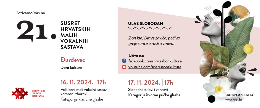 Ovog vikenda, 16. i 17. studenog 2024. u Domu kulture u Đurđevcu predstavit će se ponajbolji domaći vokalni sastavi u okviru 21. Susreta hrvatskih malih vokalnih sastava.