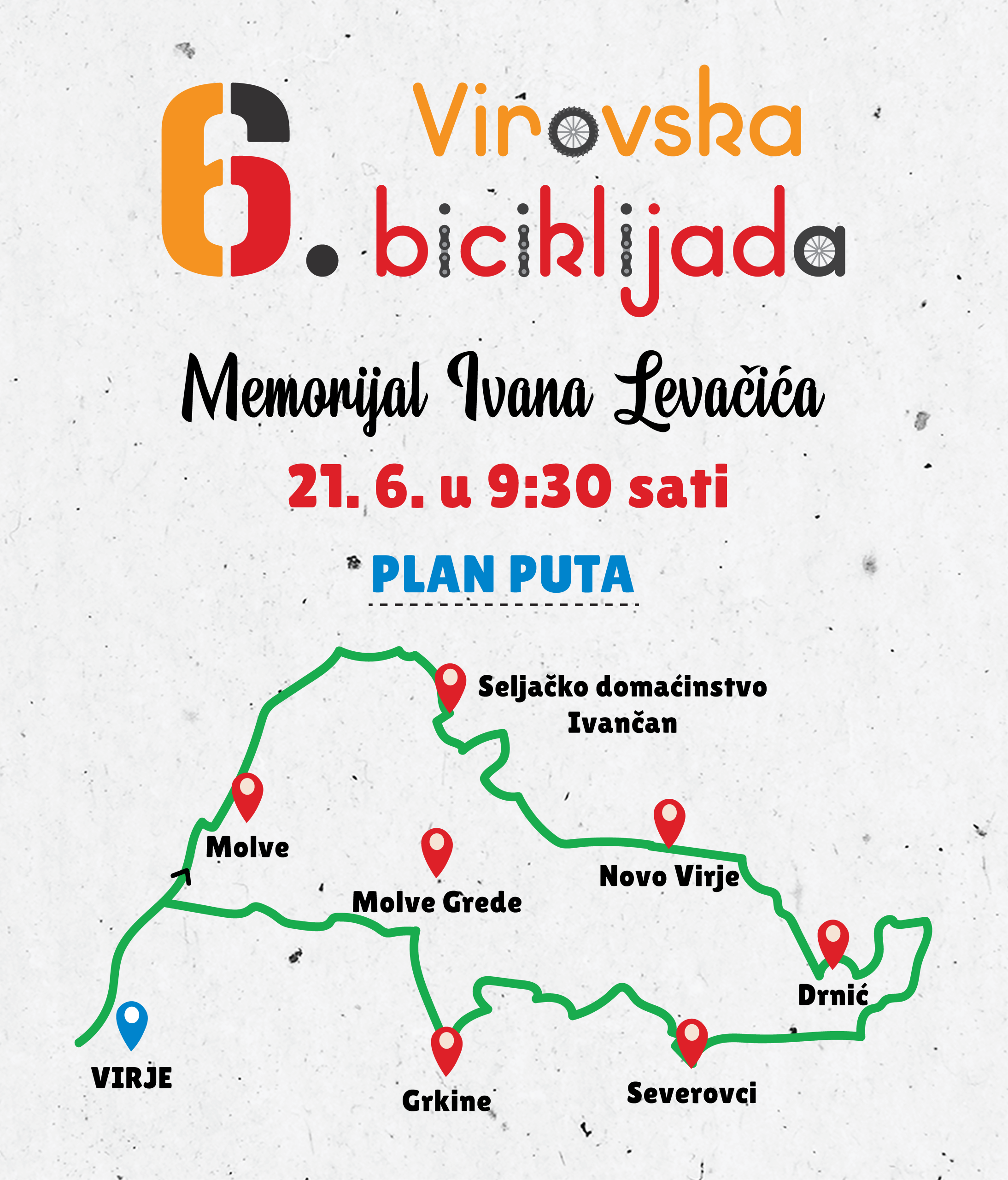 Okupljanje sudionika 6. Virovske biciklijade bit će u subotu 21. lipnja 2025. u 9:30 sati ispred zgrade Općine Virje u Ulici Đure Sudete. Ovogodišnja ruta vodi prema Molvama uz zaustavljanje na Seljačkom domaćinstvu Ivančan. Slijedi vožnja preko Novog Virja gdje će biti zaustavljanje za okrijepu i odmor na jezeru Drnić. Dalje će se voziti kroz Severovce, Grkine i Molve Grede, a cilj je na prostoru streljane Lovačke udruge u Virju. Organizatori su za sve sudionike pripremili majice i okrijepu, a na završetku slijedi druženje uz zajedničko jelo.