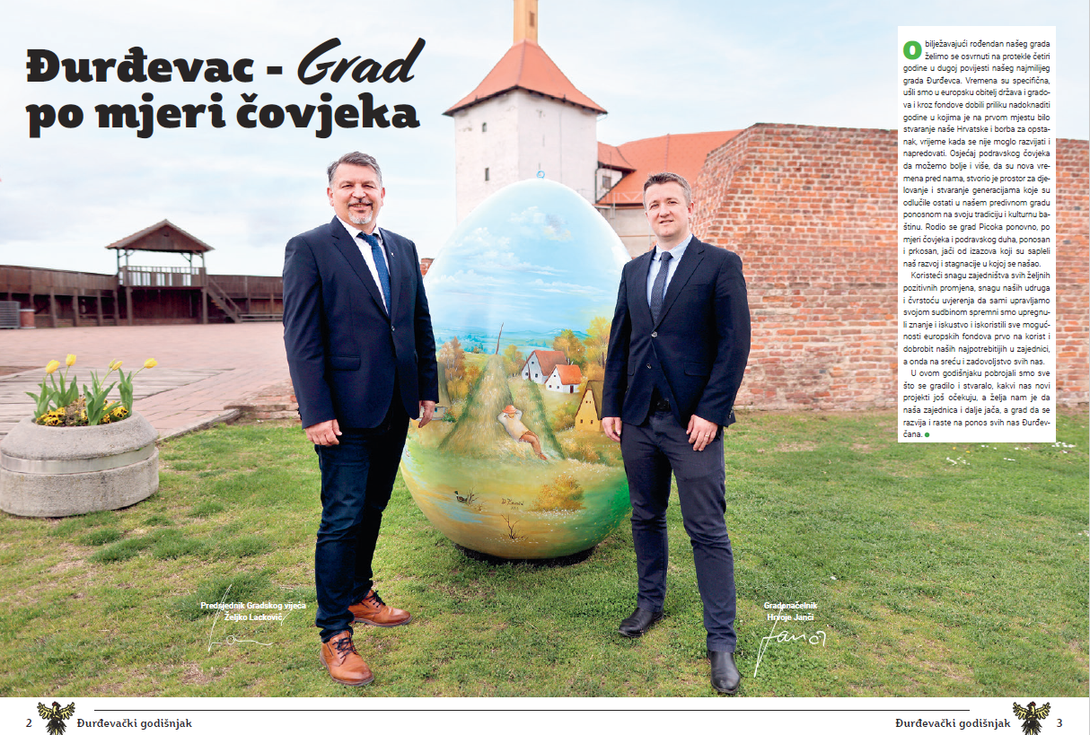 Godišnjak donosi pregled najvažnijih trenutaka, ulaganja i ostvarenja koja su obilježila jedno iznimno dinamično razdoblje za Đurđevac – razdoblje koje je oblikovalo njegov današnji izgled i značaj. Publikacija sadrži brojne fotografije, kronološki pregled aktivnosti te ističe ključne iskorake koji su Đurđevac učinili prepoznatljivim i suvremenim – Gradom po mjeri čovjeka.