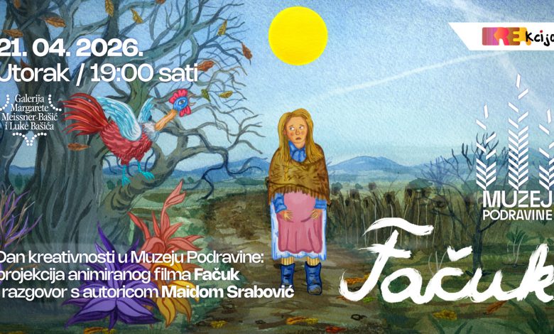 Od 19 sati u Muzeju Podravine, u prostoru Galerije Margarete Meissner Bašić i Luke Bašića, održat će se projekcija animiranog filma “Fačuk” koprivničke autorice Maide Srabović, dobitnika Nagrade Oktavijan Hrvatskog društva filmskih kritičara za najbolji animirani film za 2025. godinu. Film je snažno nadahnut podravskom naivom i opusom Mije Kovačića, a nakon projekcije publika će imati priliku razgovarati s autoricom.