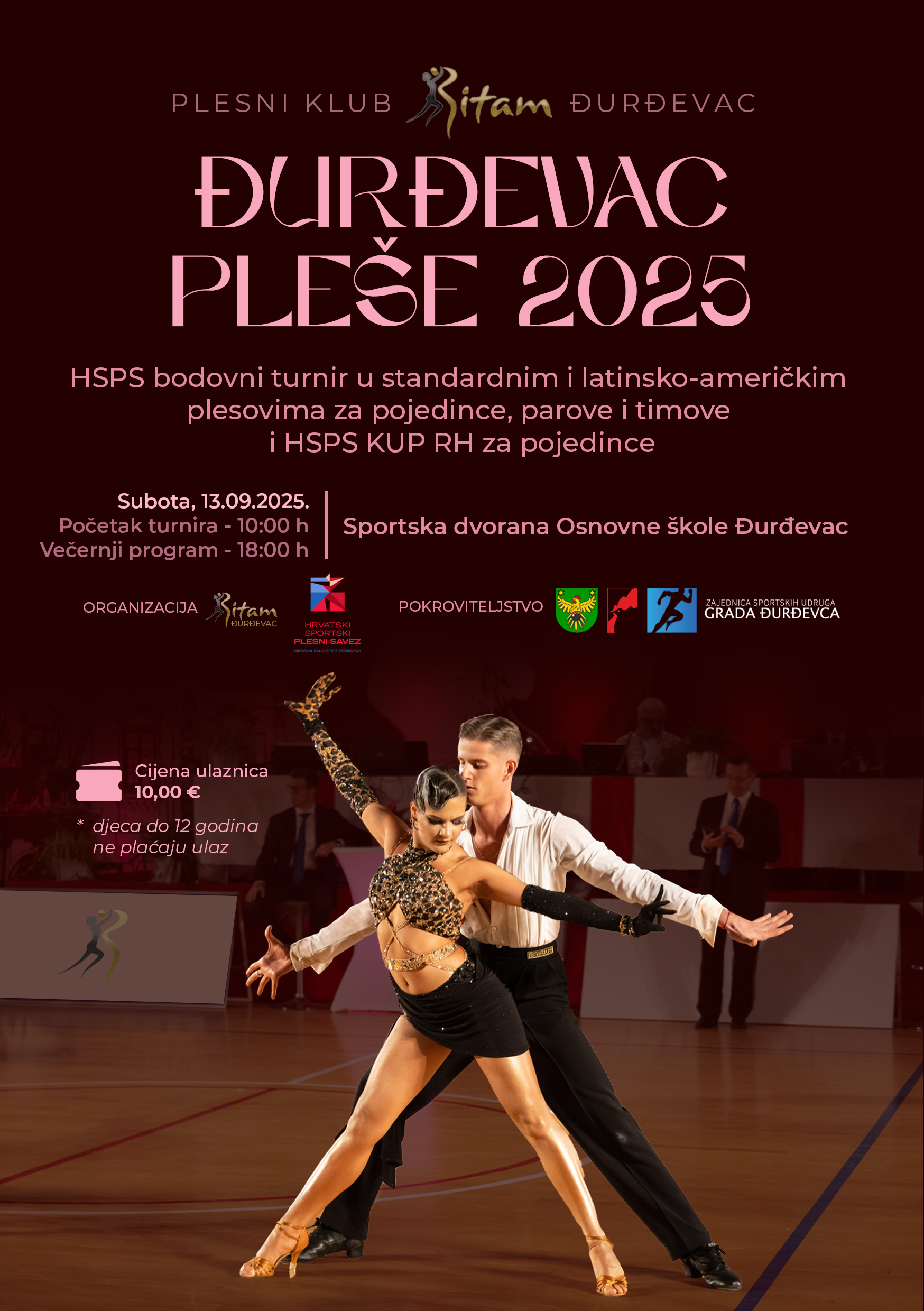 Dvorana Osnovne škole Đurđevac ugostit će natjecanje u sportskom plesu – standardnim i latinsko-američkim disciplinama – u organizaciji Plesnog kluba Ritam Đurđevac i Hrvatskog sportskog plesnog saveza.