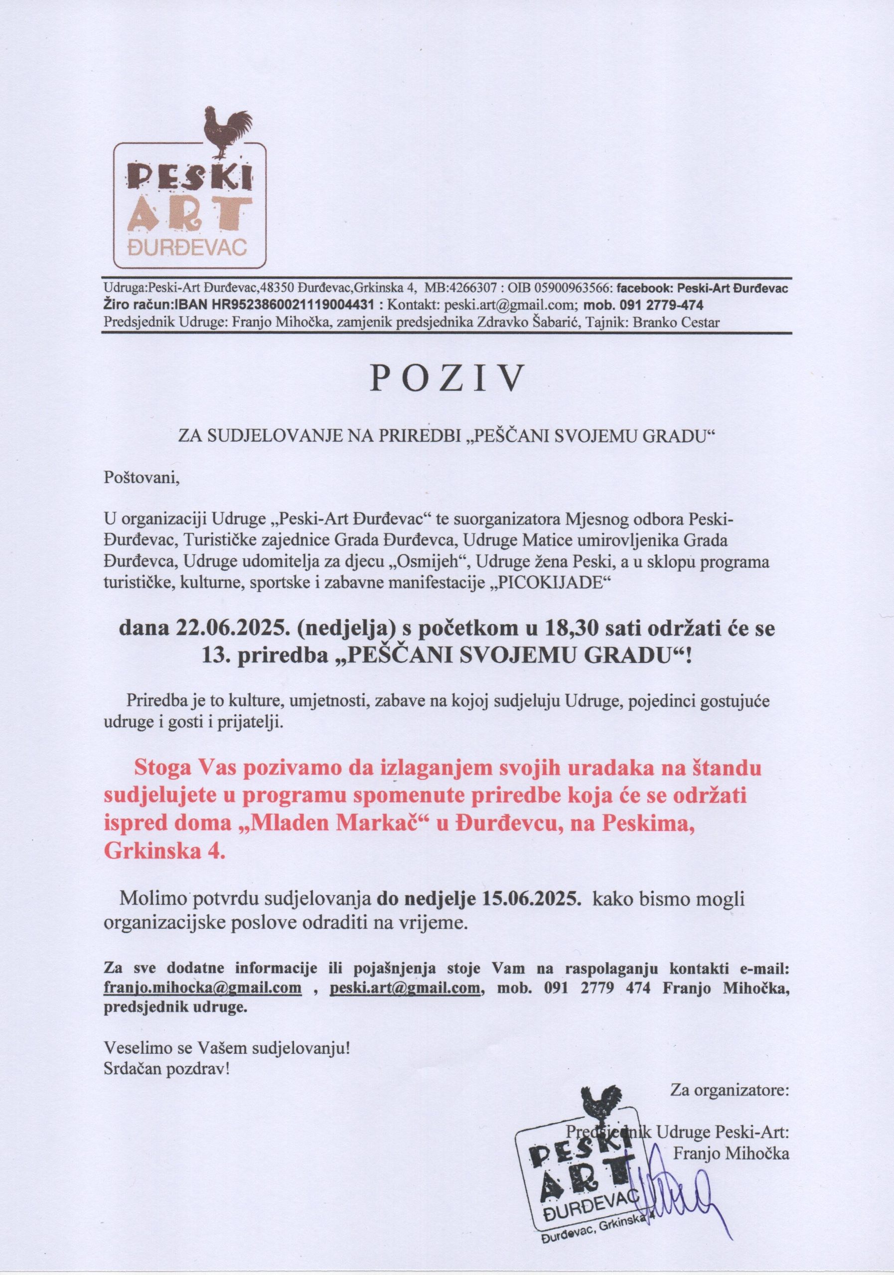 U organizaciji Udruge Peski-Art Đurđevac te suorganizatore priredbe “Peščani svojemu Gradu”, Mjesni odbor Peski-Đurđevac, Udrugu Peski-Art Đurđevac, Udrugu Matice umirovljenika Grada Đurđevca, Udrugu udomitelja “Osmijeh”, Udrugu žena Peski i Turističku zajednicu Grada Đurđevca, sudjelujte u izlaganju svojih uradaka na štandu.