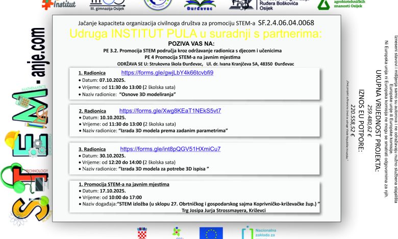 Poziv na STEM izložbu i radionice u sklopu projekta „STEManje.com“