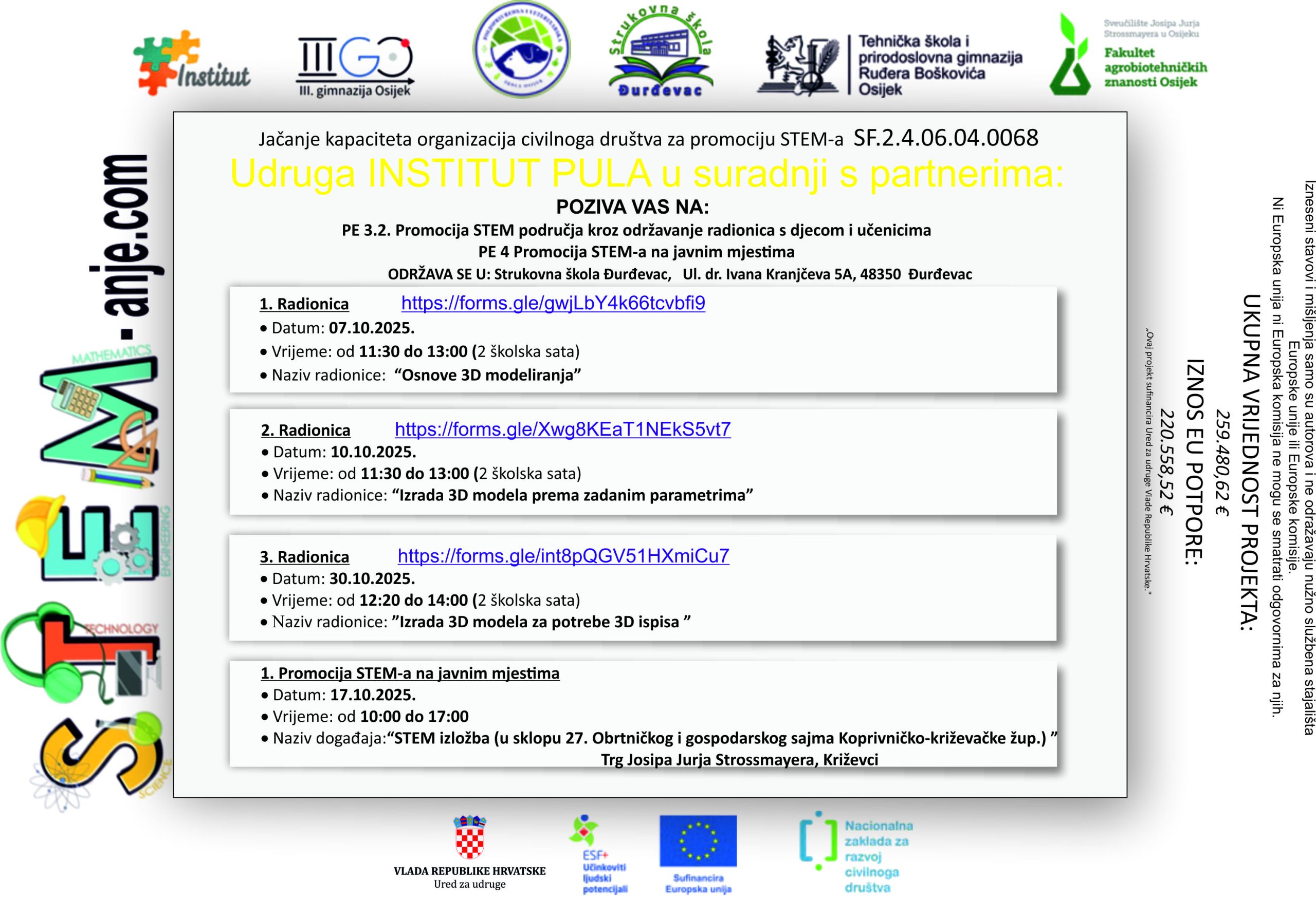 STEM izložba i radionice održavaju se u okviru projekta “STEManje.com” sufinanciranog u okviru poziva “Jačanje kapaciteta organizacija civilnog društva za promociju STEM-a” (SF.2.4.06.04.0068).