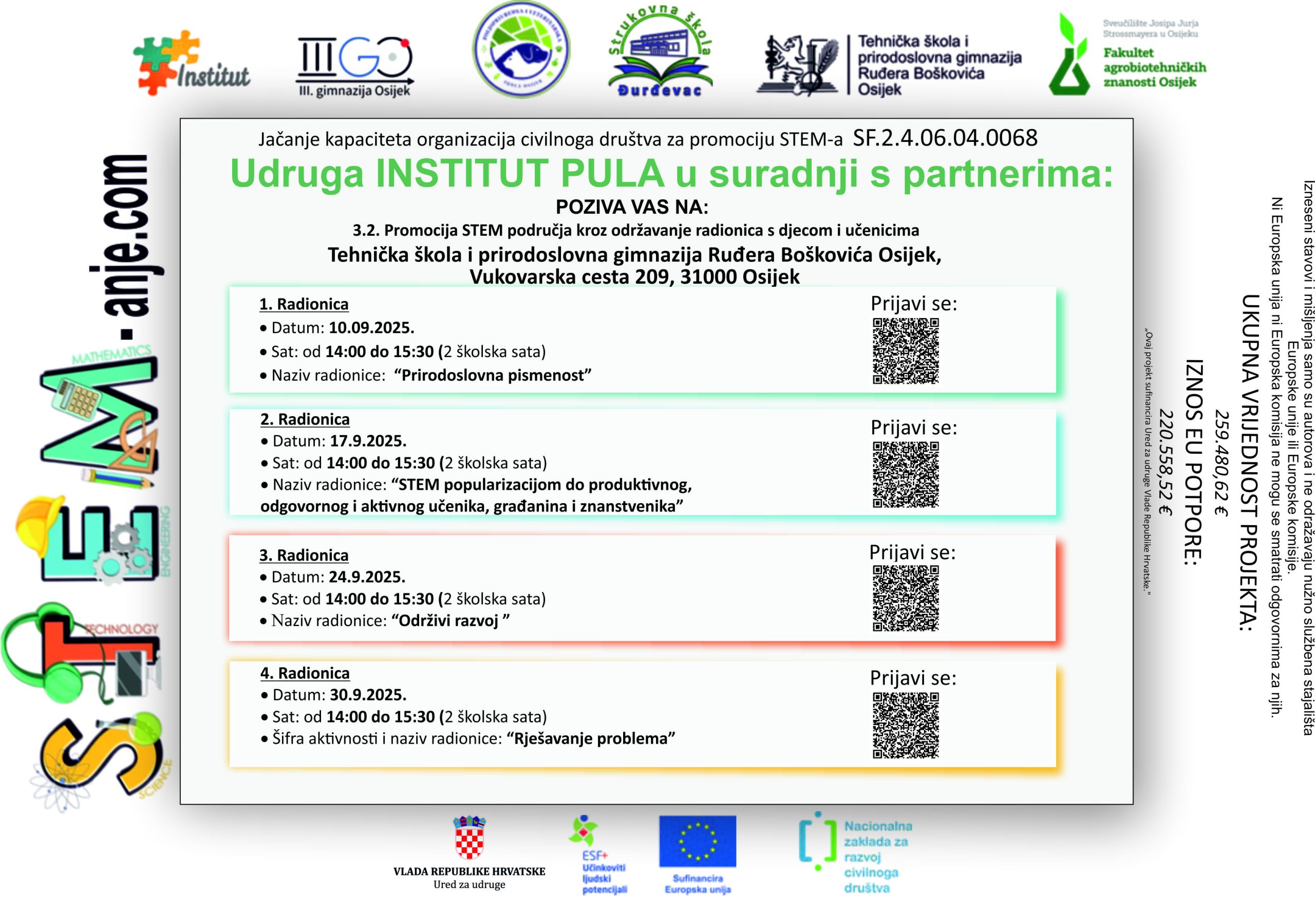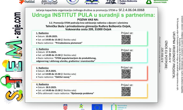 Radionice će se održati u Tehničkoj školi i prirodoslovnoj gimnaziji Ruđera Boškovića Osijek (Vukovarska cesta 209, Osijek), a namijenjene su poticanju prirodoslovne pismenosti, održivog razvoja i rješavanja problema kroz praktične i interaktivne aktivnosti.