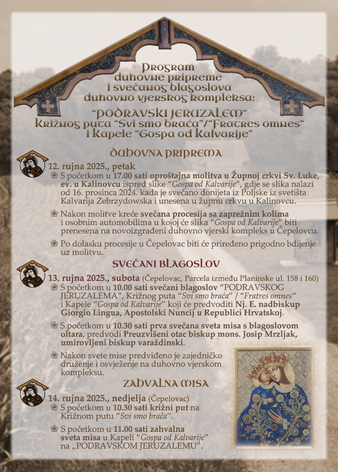 Svečanom programu 12. rujna u 17 sati prethoditi će svečana procesija sa zapregama, traktorima i osobnim automobilima u kojoj će se iz župne crkve u Kalinovcu prenijeti Marijina slika na novoizgrađeni kompleks, a dan poslije 14. rujna s početkom u 10.30 održati će se križni put i misa zahvalnica.