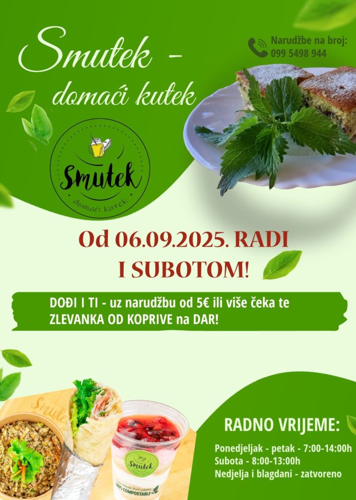 Od subote, 6. rujna, Smutek će ponovno raditi i subotom. Kako bismo zajedno obilježili povratak subotnjeg druženja u Smuteku, sve goste koji toga dana ostvare kupnju u iznosu od 5 eura ili više nagrađujemo domaćom zlevankom s koprivom.