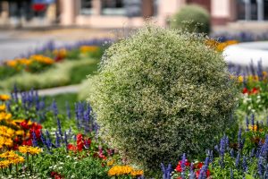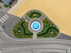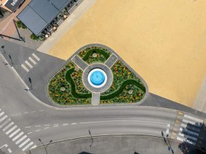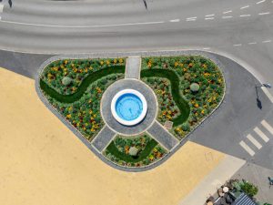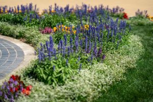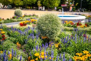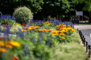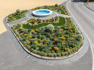 - Izdignute kugle s cvijećem i travnata staza za šetnju i fotografiranje