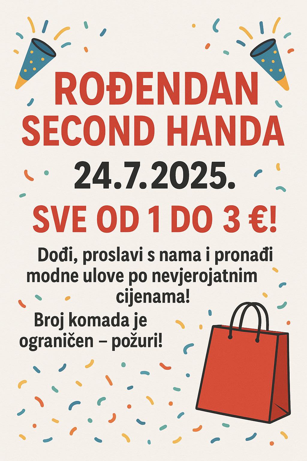 Second hand Sandi Shop danas slavi rođendan, a slavlje donosi poklone kupcima! Samo danas, 24. srpnja, svi artikli u trgovini sniženi su čak 50% – odjeća, obuća, modni dodaci i razne sitnice dostupni su već od 1 do 3 eura!