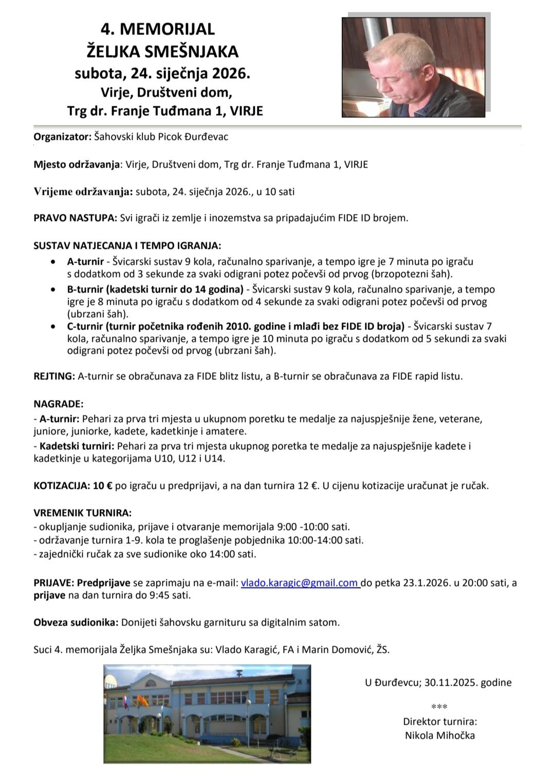 U Virju će se u subotu, 24. siječnja 2026. godine, održati 4. memorijalni šahovski turnir Željka Smešnjaka, povodom pete godišnjice preranog odlaska ovog istaknutog člana kluba.