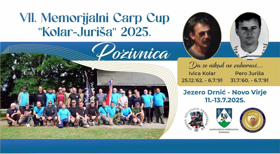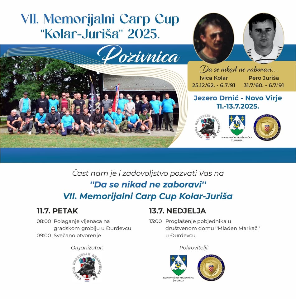 Od 11. do 13. srpnja 2025. godine na Jezeru Drnić u općini Novo Virje održat će se sedmo izdanje Memorijalnog Carp Cupa “Kolar–Juriša”, sportsko-ribolovnog natjecanja koje iz godine u godinu prerasta u snažan simbol zajedništva, poštovanja i sjećanja.
