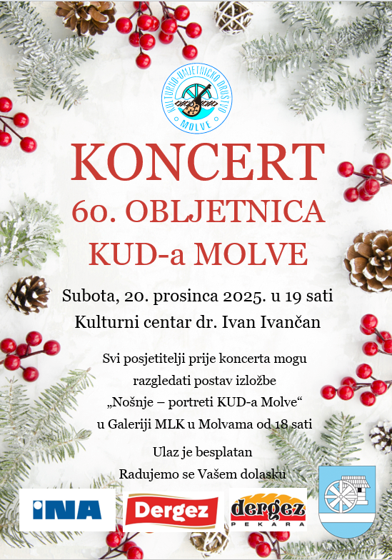 Kulturno-umjetničko društvo Molve obilježit će 60. obljetnicu djelovanja svečanim koncertom koji će se održati u subotu, 20. prosinca 2025. godine, s početkom u 19 sati, u Kulturnom centru dr. Ivan Ivančan.