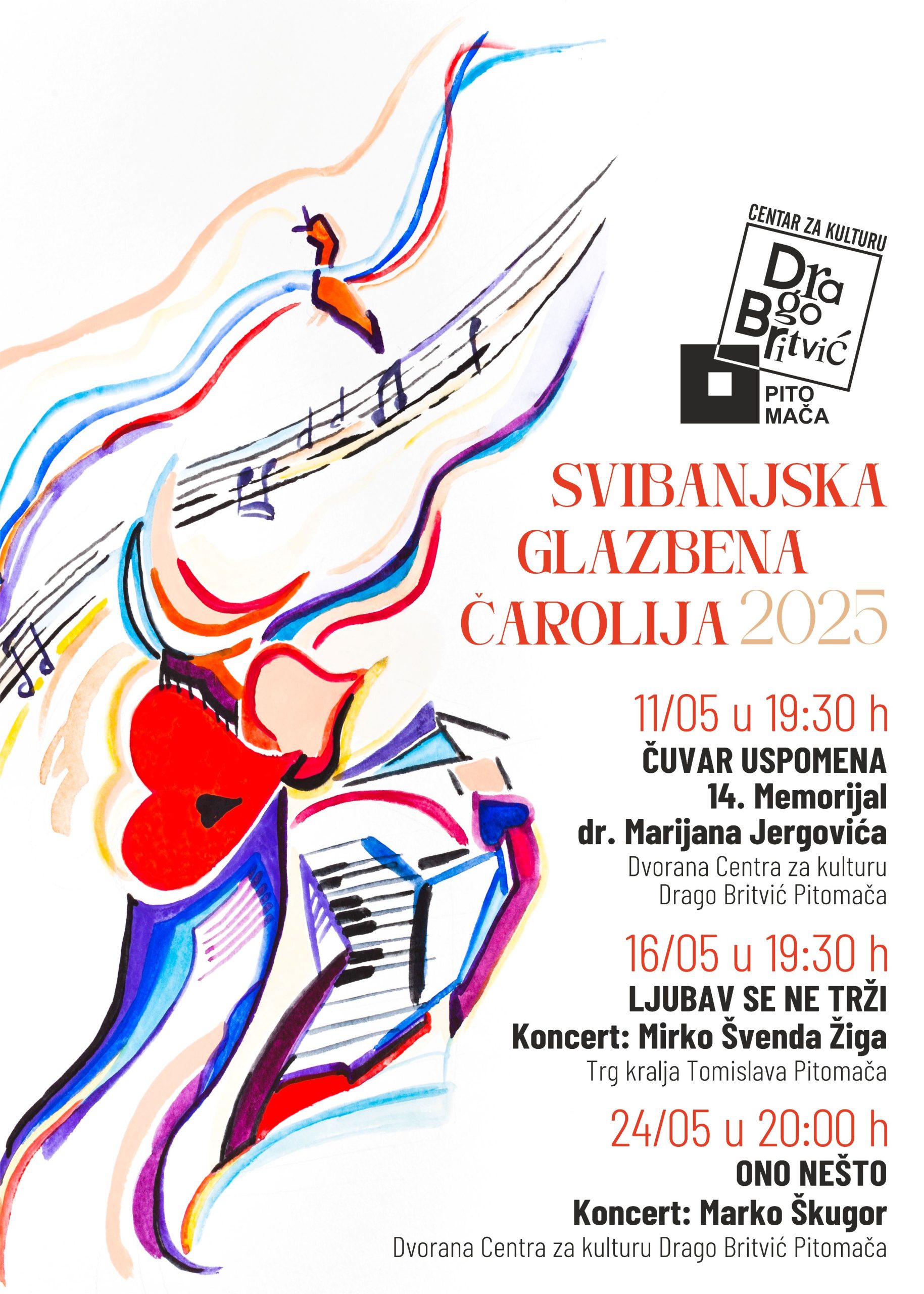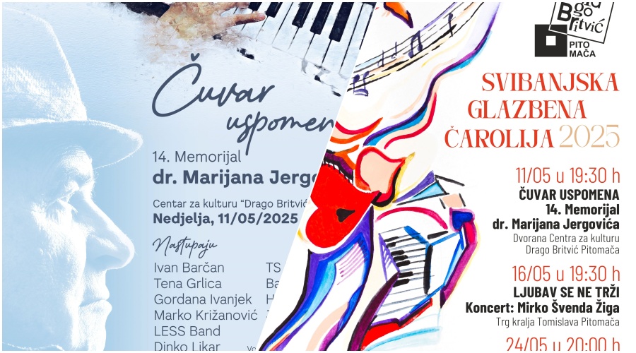 Nadalje, 16. svibnja će Mirko Švenda Žiga održati koncert „Ljubav se ne trži” na Trgu kralja Tomislava u Pitomači s početkom u 19:30 sati, dok će se predposljednje subote u mjesecu, 24. svibnja, u centru za kulturu Drago Britvić održati koncert „Ono nešto” Marka Škugora s početkom u 20 sati.