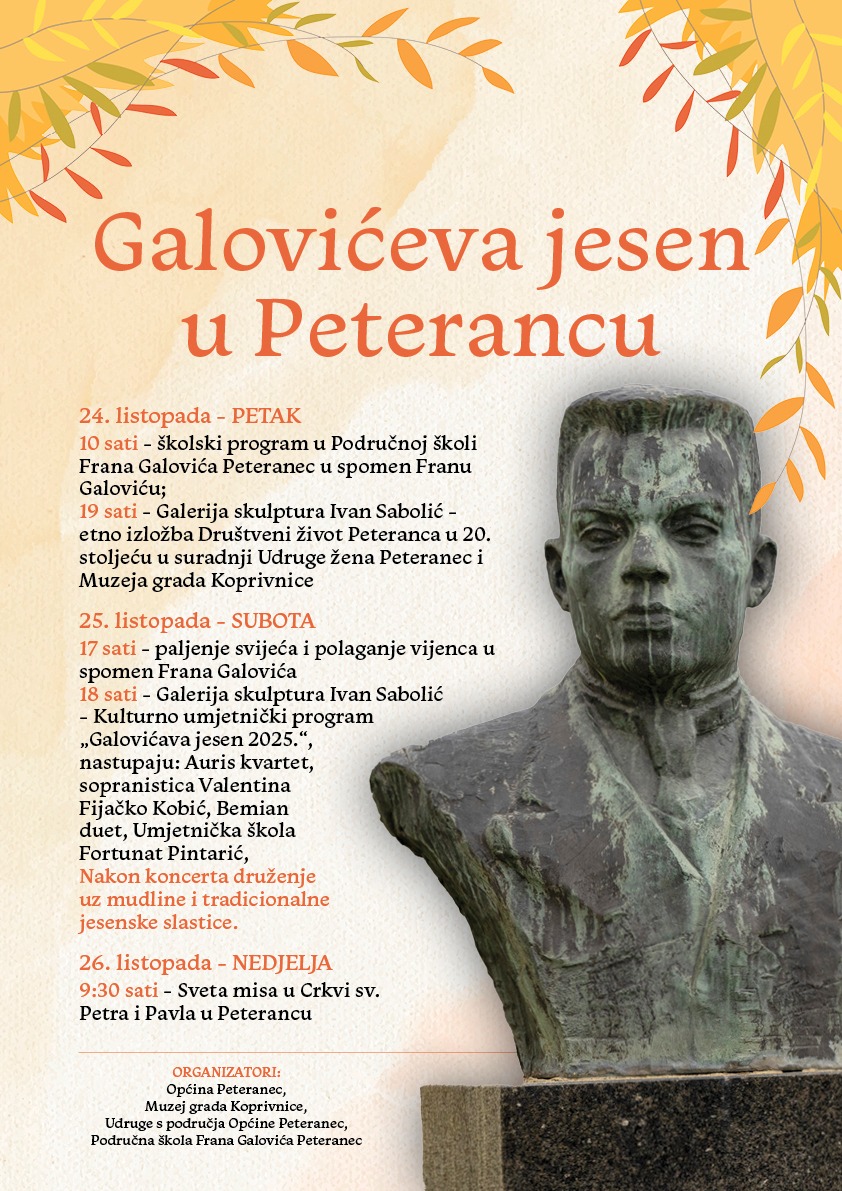 Posjetitelje Galovićeve jeseni u Peterancu u tri dana druženja, odnosno od 24. do 26. listopada, očekuju kulturni, glazbeni i tradicijski programi koji čuvaju sjećanje na Galovića i bogatu baštinu ovog kraja, poručili su iz Općine Peteranec.