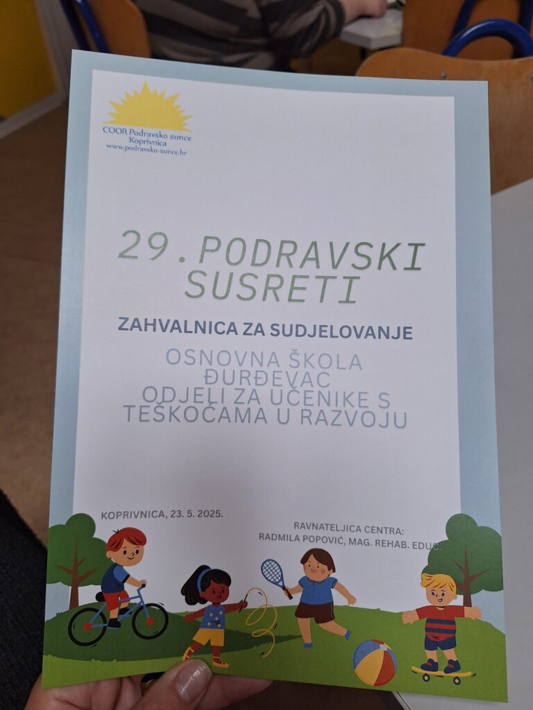 Učenici 2. i 3. odgojno-obrazovne skupine OŠ Đurđevac, Odjela za učenike s teškoćama u razvoju; Darijo Popadić, Dominik Patačko, Božica Jankov i Ivana Cik, uz pratnju učiteljica Veronike Gašparov i Tamare Malivuk, sudjelovali su u natjecanju u igrama spretnosti za učenike s teškoćama u razvoju. Igre su tradicionalno održane u sklopu 29. Podravskih susreta u Centru za odgoj, obrazovanje i rehabilitaciju “Podravsko sunce” Koprivnica. Učenici su se natjecali u 6 štafetnih igara. Osim za aktiviranje sportskog i natjecateljskog duha, bila je ovo savršena prilika i za međusobno upoznavanje i druženje učenika te su se naši učenici veoma sretni i ponosni vratili s natjecanja – stoji na kraju objave.